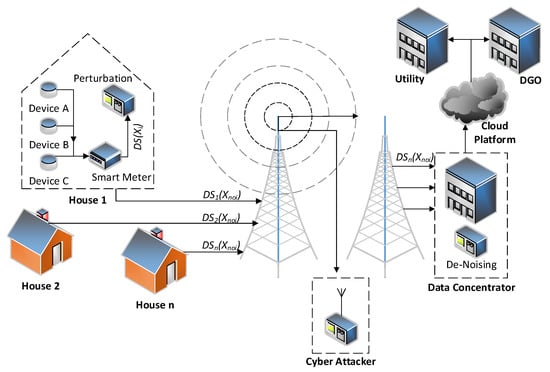 The background of the paper includes the main players of this scenario; the households (with their datasets), the electrical utility companies or the DGO (and an affiliated service provider) and the cyber attacker, illustrated in Figure 4. The smart meter of the household owner transmits the distorted power data to the utility company, that could provide real-time electricity price, charge the user or offers some service to the household (service procvider). The cyber attacker could link into the data transmission between these players [].