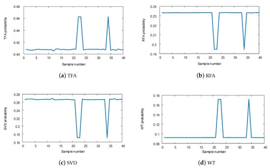 It can be found that the probability ratios of TFA in Figure 5a is much higher than those of RFA, SVD and WT. For any sample, their component in TFA reaches around 0.4117, while the probability of RFA and SVD methods account for and , respectively. The WT method contributes the least among those four approaches with only . Therefore, for these four compression methods, the TFA and WT can be respectively treated as two unique groups, that have the largest and the smallest likelihoods. In the meantime, the RFA and SVD form one group with similar probability ratios. According to the definition of in Equation (21), the accuracy of classification index is listed in Table 2. The RFA and WT generate the highest index with , while SVD and TFA follow them with 0.69 and 0.68, respectively.