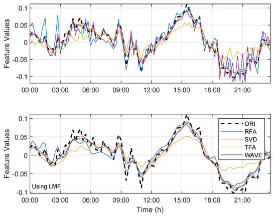 Figure 6 is long-term averaging, where the features of the power consumption traces and the features of all different approaches from all periods are averaged. This is implemented to obtain the daily power usage pattern of the customer and shows an overview of the results of the NILM detection. In Figure 6, between 00:00–03:00 o’clock the RFA results differ strongly from the original ones. The minimal ratio of distorted features to all features from Table 3 (DF/AF) results in weak feature recovery outcome during the transmission attack (Figure 6).