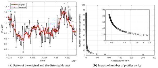 For an example, a comparison between the input and the distorted dataset with DSF = 5 is presented in Figure 7a. This figure gives an impression about the impact of the distortion on the data stream. The distorted datasets of all households will be sent to the data collector.