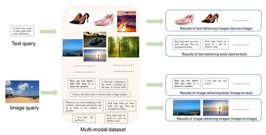 Illustration of multi-modal retrieval. At the top, the text is taken as a query to retrieve the multi-modal dataset, then ranking lists of semantic related images and texts are shown at right. At the bottom, the image is taken as a query to retrieve the multi-modal dataset, then ranking lists of semantic related texts and images are shown at right. The four kinds of retrieving tasks are called text-to-image, text-to-text, image-to-text, and image-to-image retrieval.