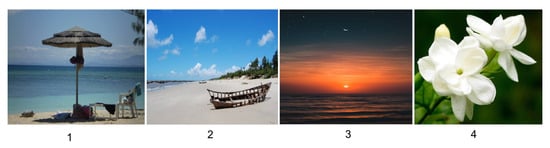 In recent studies [,,], multi-modal data are embedded as low-dimensional representations via two different deep models and learned into a shared latent space at the top layers by pulling inter-modal similar points together while separating dissimilar points far away. They learn multi-layer nonlinear transformations to align heterogeneous data based on a binary similar or dissimilar inter-modal relationship, whereas they ignore the intra-modal correlation of multi-modal data, which has been verified effective in subspace learning methods [,,,,]. In addition, a multi-scale semantic relationship is ignored in these methods, which consist of multi-scale similarities between inter-modal data and intra-modal data. Among inter-modal data, as shown in Figure 2, image 1 vs. text “blue sky and beach with rest area is a good place for vacation” are best matching, images 2 and 3 vs. the text are similar somewhat, whereas image 4 vs. the text are dissimilar. Among intra-modal data, as shown in Figure 2, images 1 vs. 2 are more similar than images 1 vs. 3; meanwhile, images 1, 2, and 3 are irrelevant to image 4.