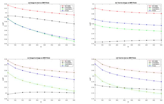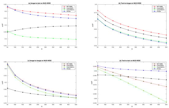 Performance curves for the NUS-WIDE dataset. The horizontal axis is the number of retrieval results R, and the vertical axis is the mAP score. The four sub-figures are for four kinds of multi-modal retrieval tasks.