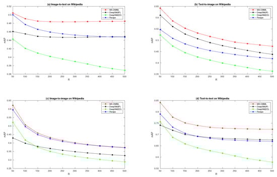 In Figure 4, the performance curves on NUS-WIDE are plotted for four retrieval tasks. Sub-figure (a) is for an image-to-text retrieval task, from which we can see that the curve of MS-DMML is above others except at the first point with . From sub-figures (b) and (c) for text-to-image and image-to-image retrieval tasks, we can obtain that our method outperforms DeepSM and Recipe. On sub-figure (d) for a text-to-text retrieval task, though the performances over are achieved by our method, the curve of MS-DMML is below that of Recipe and DeepSM with . In Figure 5, the performance curves on MIR Flickr are plotted for four retrieval tasks. From the four sub-figures, we can see that all red curves are above others. It shows that MS-DMML outperforms DeepSM and Recipe methods on four kinds of multi-modal retrieval tasks. In Figure 6, the performance curves on Wikipedia are plotted for four retrieval tasks. From sub-figure (c) for an image-to-image task, we can see that the performance of MS-DMML is slightly higher than that of the Recipe method. From the other three sub-figures, we can see that our method outperforms DeepSM and Recipe methods prominently with R from 50 to 500. These curves validate that the performances of MS-DMML are robust regardless of how many retrieval results are considered for computing mAP.