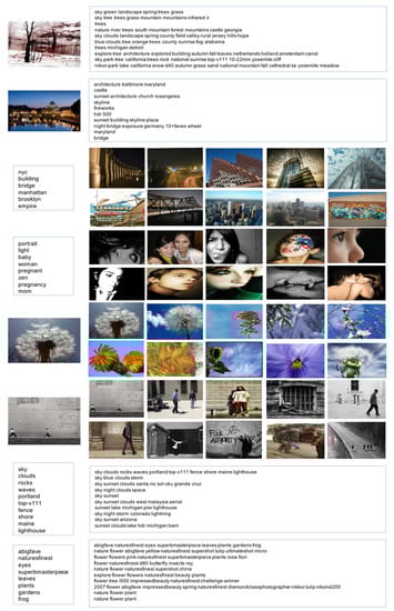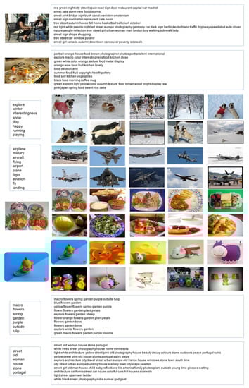 - Chua, T.S.; Tang, J.; Hong, R.; Li, H. NUS-WIDE: A real-world web image database from National University of Singapore. In Proceedings of the ACM International Conference on Image and Video Retrieval (CIVR ’09), Santorini Island, Greece, 8–10 July 2009; pp. 1–9. [Google Scholar]