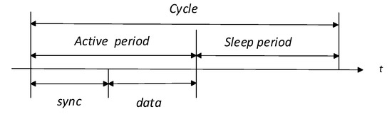 Some recent WSN MAC protocol developments employ duty-cycling (DC) to save energy and maximize the WSN lifetime. In WSN MAC protocols operating with DC, idle nodes stay in the sleep mode in order to save energy. Nodes wake up only during packet exchange periods. Medium access in WSN is based on contention deploying a Carrier Sense Multiple Access and Collision Avoidance (CSMA/CA) mechanism, and the Request-to-send/Clear-to-send/DATA/Acknowledgment (RTS/CTS/DATA/ACK) handshake [8,9]. S-MAC (Sensor-MAC) was the first WSN MAC protocol that implemented DC and remains one of the most popular [10].