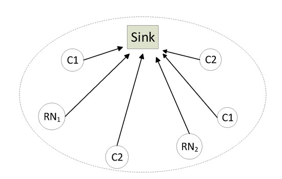 We consider a heterogeneous WSN with N nodes of different classes, where all nodes listen to each other and send packets to a common sink node, as, for example, in Figure 2.