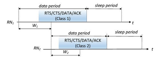 In the proposed WSN operation, the medium access priority is granted to class 1 nodes by following the next access procedure. At the beginning of a cycle, only active class 1 nodes trigger the medium access and contend for medium access among themselves. Active class 2 nodes wake up just after the class 1 contention window () has ended, and if they detect an idle medium, they will proceed to transmit, activating their own contention mechanism. If class 2 nodes detect the medium occupied at that instant, they return to sleep mode and wake up again at the next cycle. We assume that the duration of a packet transmitted by a class 1 node is longer than .