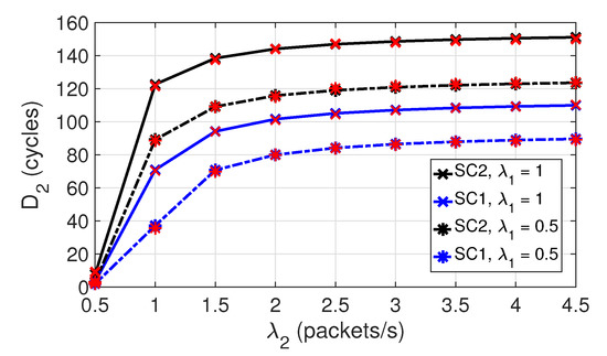 Figure 5 shows the evolution of the average delay for class 2 nodes with in both scenarios, and with different values. Note that for SC1, , and for SC2, . Curves show that increases rapidly with , until approximately . For higher loads, increases slowly. As expected in SC2, where the number of nodes is larger, takes values higher than in SC1. When the number of nodes increases, contention also increases, and it takes longer to access the channel. Therefore, packets wait longer in the queue before being transmitted. In addition, more collisions and, hence, more retransmissions occur. Observe also that increases with . This can be explained in the same terms as those used to explain the results of Figure 4.