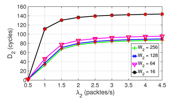 However, for nodes of class 2, the packet arrival rate takes values in the range . Note that the fraction of class 2 packets that collide increases with . As the number of retransmissions increase, also increases. Note also that as class 1 traffic load increases, class 2 nodes perceive the channel as busy for longer periods. Therefore, class 2 nodes take longer to transmit their packets, and their delay increases.