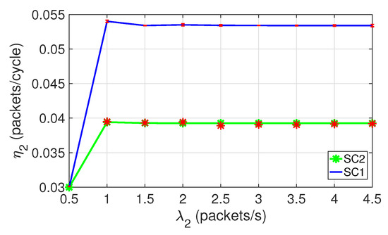 Figure 7 shows the throughput per class 2 node for both scenarios. In both scenarios, reaches the saturation level for loads of approximately , observing a relatively constant behavior for higher loads. In addition, note that is higher in SC1 than in SC2. This is because in SC1 the number of nodes is smaller and, therefore, there is less channel contention.