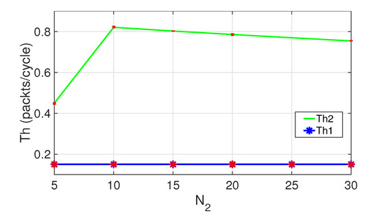 Figure 8 shows the aggregated throughput for both classes of nodes as a function of . Results are obtained with the following general configuration changes: , . Observe that reaches a maximum for , and for higher values, it decreases gradually. Clearly, decreases because as increases, the contention increases, collisions increase, retransmissions increase, and the average packet delay increases. However, remains constant as is kept constant, and class 2 nodes have no influence on the perception that class 1 nodes have of the state of the channel.