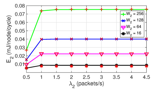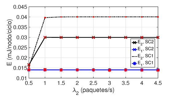 Figure 9 also shows that is lower than , and constant with . This is due to the fact that class 1 nodes have priority over class 2 nodes. For class 2 nodes, the packet arrival rate takes values in the interval , and the number of nodes in the network is different for each scenario. Observe in Figure 9 an initial linear increase of the energy consumption for class 2 nodes in both scenarios. At approximately packets/s, the saturation load is reached and the activity of nodes, as well as their energy consumption, also reaches its limit.