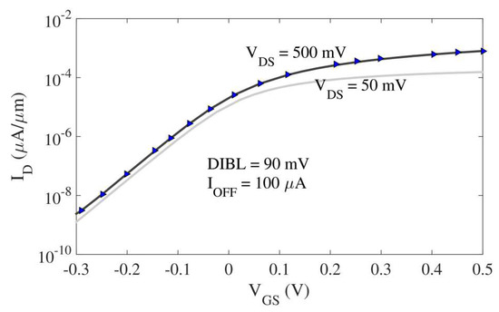 Figure 1 shows the architecture of the -based HEMT [18]. The real physical device operation was simulated using a process equivalent TCAD simulation [19]. To design interface, was deposited over the insulator, and over it, an layer was deposited for device formation. Then, a gate insulator layer was deposited at the top. Tin material was deposited over the layer which formed the gate layer. After the device design, a simulation-based device characterization was done using the TCAD simulator [19]. The values used for and are 180 Ω/μm and 100 nA/μm, respectively, are obtained at = 0.5 V and calibrated as per the experimental data [20]. Other important parameters are shown in Table 1. Figure 2 shows the current–voltage characteristics of a device with = 22 nm, and = 30 nm. Figure 2 and Table 1 both show the calibration results with experimental data [20].