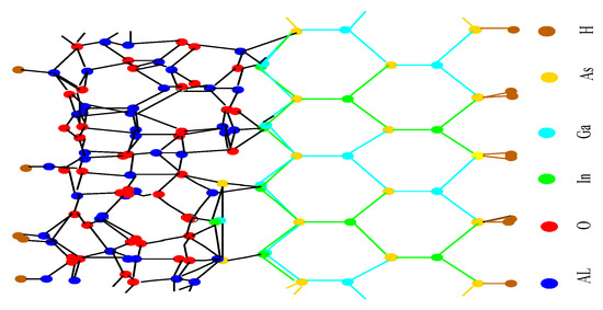 To understand the BTI effect in the proposed device, we need to understand the bulk–oxide and oxide–metal interface properties. The properties of this interface depend on the gate oxide materials such as , , , , and . The unbounded states, the band-decomposed charge density corresponding to the bandgap pinning energy interval are shown in a 3D plot by Kim et al. [21]. This 3D plot can be used to determine the exact location and the number of dangling bonds at the and insulator interface. The unbounded states are localized at the existing coordinated Aluminum () atoms which have bonded with two Oxygen () atoms and one Hydrogen (H) atom. In amorphous bulk, and primarily have four bonds with O, as shown in Figure 3. These dangling bonds change the electrical properties of a device and increase the density of the existing interface trapped charges ().