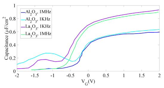 Capacitance voltage (CV) curves of different materials at 1 KHz and 1 MHz frequencies (AC analysis).