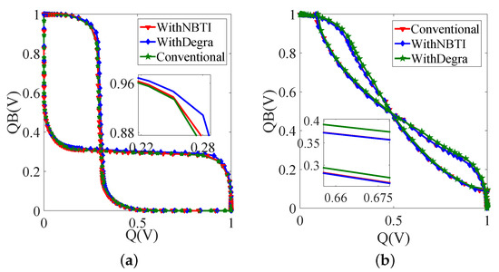The SNM butterfly curves of the proposed SRAM cell is shown in Figure 7a. We take a standard Gaussian doping and initial = . The increases with three-year stress. A similar result is also shown for the RNM (as shown in Figure 7b). These variations can not be considered under the most of the available spice–circuit simulators. Hence, most of the circuit simulators can not predict the reliability of the chip (in terms of the lifetime). The MOSERA model bases reliability simulation can be performed in the H-SPICE simulator, but it uses a fundamental power–law model. Hence, the proposed BTI model, which is developed especially for -based FinFET, can be used in circuit simulation.