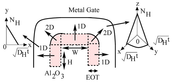 Similarly, the above explanation can be used to estimate the diffusion of hydrogen on a 2D surface. In the prescribed structure, the side and top walls show 1D diffusion, whereas the two corners show the 2D diffusion interface, as shown in Figure 8a,b. Hence, the interface state density generated by BTI is given by: