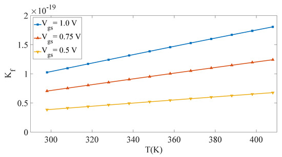 where is the activation energy, is the pre-exponential factor, K is the Boltzmann constant, and T is the temperature in Kelvins. The values of the pre-exponential factor and the activation energy for an substrate and insulator -based HEMT are derived in this work. The default value of used in the literature is in the range of to [25], and the values of for and are and , respectively [25]. Hence, these values have been employed in different simulation experiments to find the optimal value for the interface. The change of the electron capture cross-section with respect to temperature variation is depicted in Figure 9 which shows that is directly proportional to the temperature and that increases as increases. The effective oxide field () and the effective potential depends on the gate voltage (), the threshold voltage (), and the oxide capacitance (). Hence, can be modeled as: