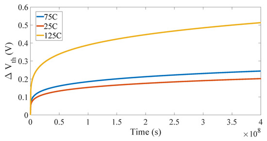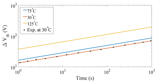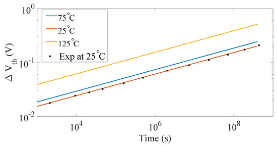 To verify the proposed model, modeling results are compared with the experimental result. The first model is verified for silicon-based MOSFET (Figure 11) and further, it is verified for 3D InGaAs HEMT. It is also used to predict the lifetime prediction of the SRAM. The required parameters are calculated from the model file for the model. The flat band voltage and the vertical gate oxide () are calculated from the BSIM model then the change in the threshold voltage () due to PBTI is calculated. All calculated and optimized parameters are shown in Table 2. The comparative results for the model with the experimental results for the change in the threshold voltage are shown in Table 3 [27,28,29,30]. All results are calculated for different device dimensions, but one of the available studies is very similar to the proposed work, hence, we made a detailed comparison with the similar study. Hence, the proposed model has been further verified using the experimental results for 10-year stress and different temperatures values obtained from data given by Franco et al. [30]. The stress voltage from −1 V to maximum has been applied for the P-FinFET. The initial trap density () from −1 V to maximum was extracted from [30]. The hole capture constant () is calculated using the proposed model and calibrated as per the literature. The simulation results for 10-year stress are shown in Figure 12 [30] which clearly shows that PBTI is strongly affected by the vertical electric field has a linear relationship with . A similar plot at a scale is shown in Figure 13 [30].