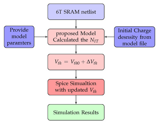 Circuit simulation was conducted using the 6T SRAM cell for testing purposes. The total change in the trap charge density for three-year stress and the corresponding shift in the threshold voltage was calculated. The simulation flow and strategy are shown in Figure 14. The initial charge density and the other parameters are calculated from the device model file. In HSPICE, the parameters given by the command in the spice net-list are used to calculate the change in the threshold voltage due to BTI i.e., . The command used to simulate the second stage gives the final simulation output. Figure 15 shows the comparative results of the proposed model and TCAD simulation for a 6T SRAM cell. The SNM and RNM results of the 6T SRAM cell are calibrated according to the TCAD simulation results.