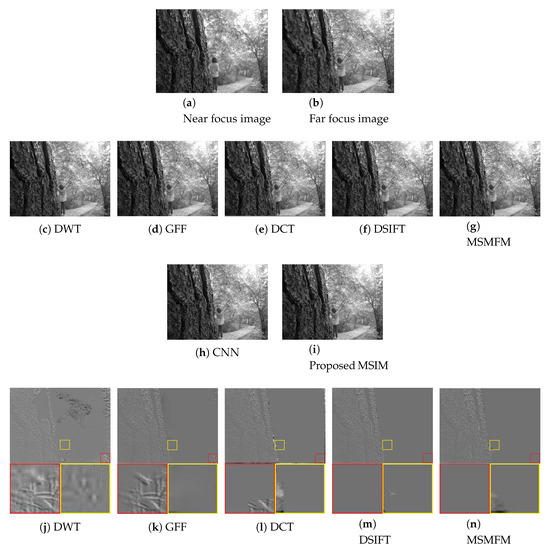 Another challenge for multi-focus fusion includes the performance in dynamic scenes. The scenario occurs either due to the movement of the camera or the motion of the object. So it is important to verify the effectiveness of the MSIM result with the existing ones on such scenes. Figure 8a,b shows near and far focus “Girl” images, respectively. The results of MSIM and existing techniques are shown in Figure 8c–i, while Figure 8j–p shows difference images. As shown in the red and yellow boxes, the DWT, GFF, DCT, DSIFT, and MSMFM methods are unable to completely fuse the focus regions. Moreover, the CNN has produced erosion in the fused image, whereas the proposed MSIM has successfully mitigated the inconsistencies and limitations of the existing techniques.