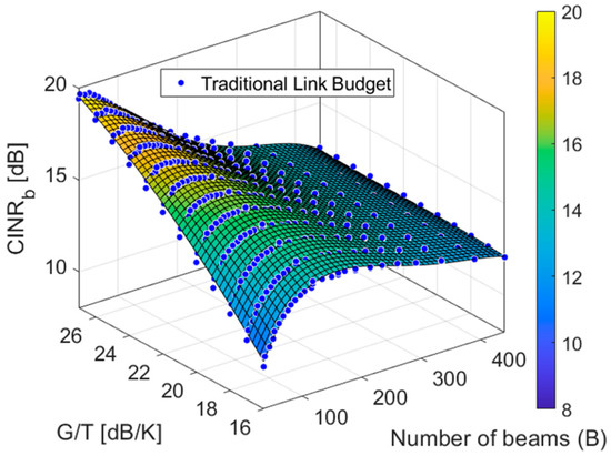 This paper proposes an analytical model of the average CINR per beam (in dB) as in (16). This model depends on the number of beams (B), the G/T (dB/K) of the user terminals, and the annual availability (P). The are the fitting terms due to the link availability obtained from the rain attenuation in the service area.