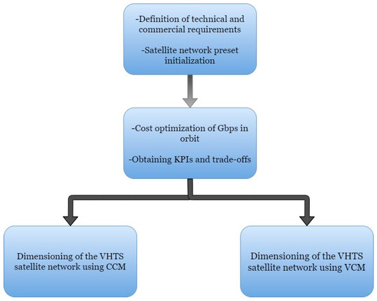 The design of VHTS systems must take into account various technical and commercial requirements and constraints. In the literature, the formal optimization and dimensioning methodology for multibeam satellite networks has been presented in pioneering contributions in [16,17], where analytical expressions of some key parameters of satellite link design are presented. However, the cost of the ground segment is not included, and neither the user station G/T nor link availability are part of the methodology.