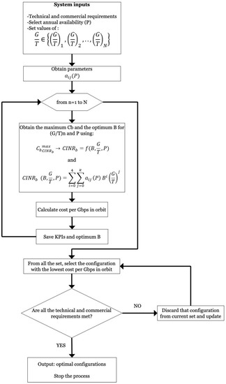 The algorithm for the optimization of the cost per Gbps in orbit, as well as the calculation of KPIs and trade-offs for the design of the VHTS satellite network, is shown in Figure 3. The minimization of the cost of Gbps in orbit for the maximum capacity is obtained by the maximum depending on the number of beams, the user G/T, and for the required link availability using Equation (16).