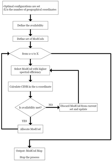 VHTS systems are based on the following technical considerations to achieve expected performance and overcome atmospheric attenuations in Ka-band satellite links: multibeam footprint in the service area, the reuse of frequency and polarization [4,7], the use of highly spectral efficient transmission techniques (e.g., DVB-S2X) and, advanced link adaptation strategies, such as Variable and Adaptive Coding and Modulation (VCM and ACM, respectively) [8]. From a system design perspective, the use of link adaptation techniques is motivated by the need to select the most appropriate modulation and coding scheme to meet the link budget conditions and availability requirements of each user terminal in the service area. A worst-case scenario satellite-link-based system design involves an inefficient approach and the expenditure of valuable communication resources [9].