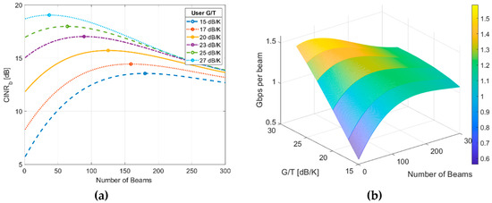 In addition, there are currently well-studied methodologies that estimate and optimize wireless communication network parameters, particularly those applied to Wireless Local Area Network (WLAN) [18,19,20]. However, the general objective of this paper is to evaluate and optimize VHTS systems whose link conditions, architecture, and cost structure are very specific and rather different to other wireless communication systems. This work proposes an optimization methodology to design VHTS systems based on geostationary platforms in order to obtain the minimum cost per Gbps in orbit, where the optimization depends not only on the number of beams, but also on the user G/T and the link availability, according to a set of technical and commercial requirements. This methodology minimizes the cost per Gbps in orbit by maximizing the capacity of the channel per beam based on an analytical expression of the average CINR as a function of the number of beams, the user G/T and the link availability. Therefore, optimal values can be obtained straightforwardly.