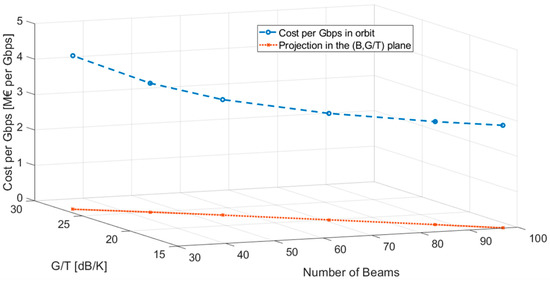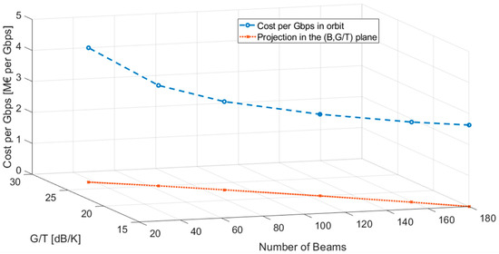Finally, an additional limit associated to the maximum total cost of the system can be defined. The satellite cost model (15) includes a constant cost of 180 M€ [16], including an average launch cost of 100 M€ and a fixed cost of 80 M€ as the minimum price of a broadband payload. A corrective term has been added according to the number of beams (B) [16].