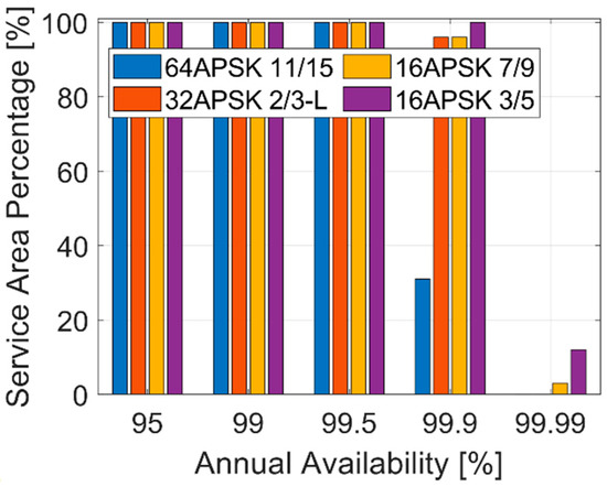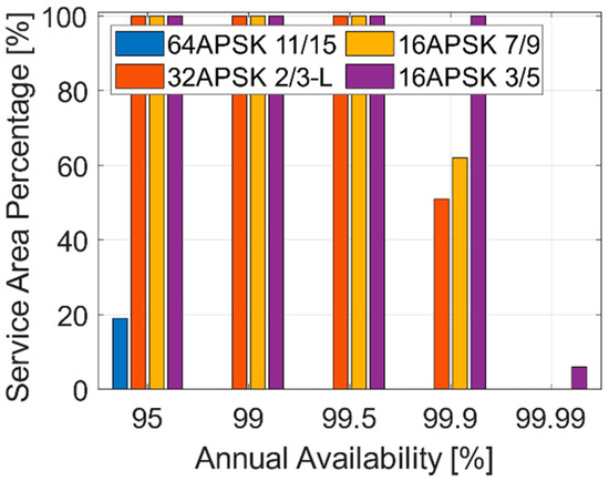 For scenario 2, the percentage of the service area that meets the requirements for 17 dB/K, 87 beams, and different availabilities in case of using CCM is shown in Figure 12. It is observed that in scenario 2, it is feasible to use 64APSK 11/15 up to an availability of 99.7%. When using 32APSK 2/3-L, 16APSK 7/9, or 16APSK 3/5, 99.9% is the maximum link availability that meets the minimum service area percentage.