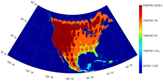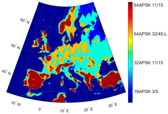 Figure 13 shows the distribution of ModCods within the service area for VCM. Availability can be increased up to 99.9%, meeting 100% SAP compliance by using four different ModCods in the service area (64APSK 11/15, 16APSK 32/45-L, 32APSK 11/15, and 16APSK 3/5).