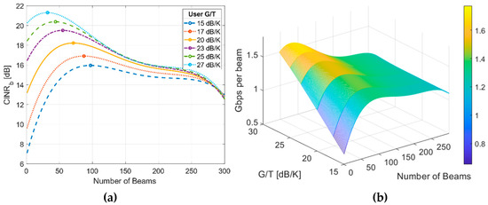 Equation (16) has been derived from multiple simulations evaluating different scenarios and different technical requirements. In these simulations, the is obtained. A total of 14,000 different combinations of the number of beams, user G/T, and link availability for each scenario have been evaluated to obtain .