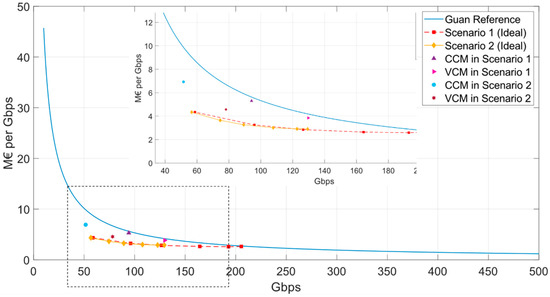 If we analyze the cost per Gbps in orbit, in scenario 1, the cost per Gbps in orbit is between 2.63 and 4.34 M€, while in scenario 2 the range is from 2.90 to 4.34 M€. For the same user G/T, the cost per Gbps in orbit is lower for higher satellite capacities.