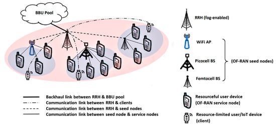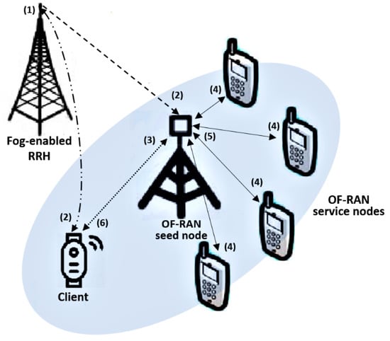 Figure 2 shows an OF-RAN seed node that lies in the coverage of a fog-enabled RRH and is surrounded by resourceful user devices that it can recruit as service nodes to form a v-FAP (shaded in blue) for a resource-limited user or IoT client device with computation-intensive and delay-sensitive tasks to be performed. The communication links between the seed node and RRH can be wired or wireless, while only wireless links exist between the seed node and service nodes, between the seed node and client and between the client and RRH. As the RRH coordinates the transmission and reception between various nodes involved in the v-FAP formation, we consider the communication environment as an interference-limited environment.
