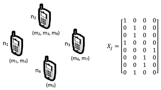 For a given number of service tasks and number of service nodes, denote as the set of possible TNAs, as the cardinality of set (i.e., ) and as the TNA of where . Figure 3 shows an example of TNA, denoted by , for and . is given as an binary matrix where a non-zero entry at an column and row indicates a certain task is assigned to an node. If is an element of the TNA matrix, then constraints Equations (5) and (6) for an task and node, respectively, must be satisfied in defining each TNA.
