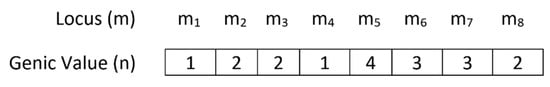 Figure 4 shows an example of our chromosome encoding for the case of 4 service nodes and 8 service tasks (, ). The encoded chromosome represents a specific TNA, where tasks 1 and 4 ( and ) are assigned to node 1 (); tasks 2, 3 and 8 are assigned to node 2; tasks 6 and 7 are assigned to node 3 and finally, task 5 is assigned to node 4.