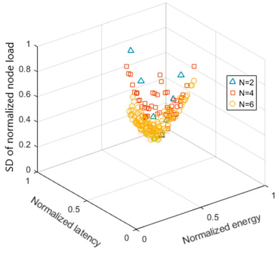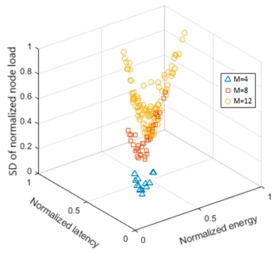 Figure 6 shows the pareto-fronts obtained under varying numbers of service tasks (), while maintaining the number of service nodes to its default value (). The number of pareto-points clearly increases with due to a greater population size and diversity of parent chromosomes arising from longer chromosome lengths. In addition, the pareto-fronts can be seen to shift towards higher energy and latency costs, which are confirmed by their higher mean and maximum values as shown in Table 3. This is because as increases, the demand for energy and time resources for each service node in a TNA increases, resulting in higher overall energy and latency costs of the TNAs.