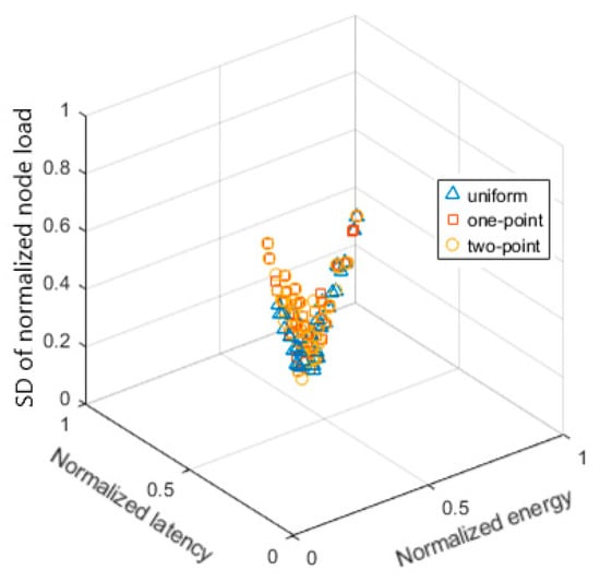 The impact of utilizing different crossover operators, single-point, two-point and uniform crossover, on the obtained pareto-fronts under a default number of service nodes and service tasks () is shown in Figure 7. It is found that while uniform crossover produced fewer pareto-points (55) than one-point (58) and two-point (64) crossovers, the solutions obtained are more optimal than those under one-point and two-point crossover. This can be observed from their closer proximity to the most optimal point, which is the point-of-origin (0,0,0). This observation is also statistically verified by a C-metric comparison of the solutions as shown in Table 4.