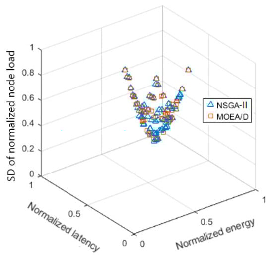 Figure 8 compares the obtained solutions by MOEA/D with those obtained by a competing technique, NSGA-II, under a default number of service nodes and service tasks (). The pareto-points of MOEA/D are found to have slightly lower values (closer to the point-of-origin), suggesting the solutions are more optimal than those from NSGA-II. This is confirmed by a C-metric comparison in Table 5 which shows that MOEA/D has a higher percentage of non-dominated solutions than NSGA-II.