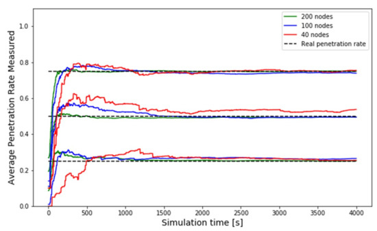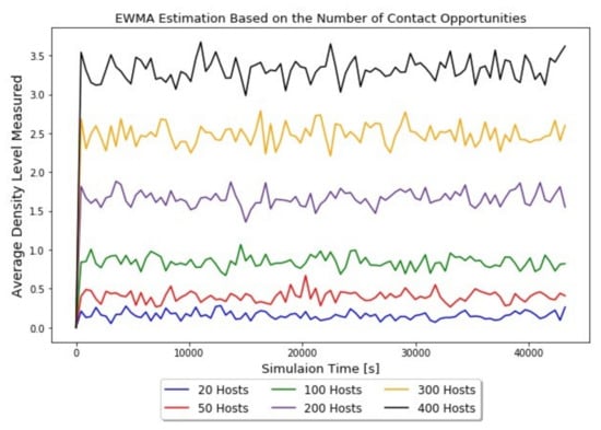 Figure 1 shows the evolution of the average density level estimated with Equation (2) in simulations encompassing a different number of nodes, proving that it is possible for each node to estimate accurately the average network density level, just by monitoring the number of contacts over time.