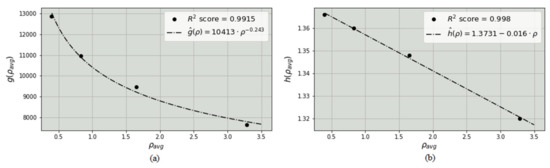 With respect to the formulation of the and the expressions, by selecting their corresponding target parameters presented in Table 2, it can be observed, as depicted in Figure 2, that both describe a well-modeled decay relative to the average density level, ρavg, measured in simulations deploying a different number of nodes.