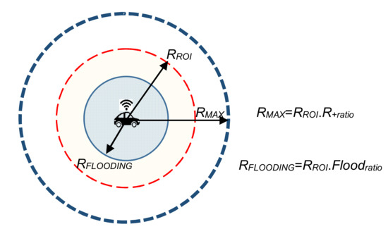 The V-GRADIENT uses the penetration rate metric to control the number of uninterested vehicles that should cooperate in forwarding messages of geocast groups of low penetration rates. The term control stems from the limited amount of shared resources available, which implies the management of a trade-off. The more forwarding load assigned to nodes that are not interested in messages results in an improvement in the delivery performance of such messages. In contrast, the resources spent on carrying and forwarding messages which the nodes have no interest in end up, inevitably, compromising the delivery of those in which they are interested. Thus, to allow a fair distribution of the forwarding load, the proposed algorithm for the V-GRADIENT defines a flooding region within the ROI whose area covers a portion of the ROIs directly linked to the penetration rate measured. In this sense, the radius of these regions is obtained as the product between the corresponding ROIs’ radiuses and a variable, Floodratio, computed as a function of the penetration rate and the messages’ initial TTL as shown in Equation (7). It should be noted that messages are disseminated within the flooding region near the ROI center even when they run out of tickets.