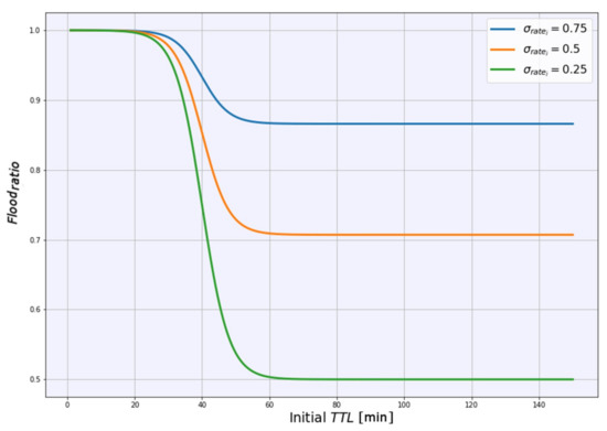 The inclusion of the TTL parameter in the expression of the Floodratio relates to the volatility of messages with low values of TTL, meaning that such messages are dropped shortly after they are created and, for that reason, should be disseminated quickly as they only constrain the available resources in the network for brief periods of time. A threshold of 40 minutes for the TTL was considered, as messages with shorter TTL values expire very soon. Figure 5 shows the resulting graph regarding the Floodratio outcome for distinct penetration rates and different initial TTL values (with a logistic function similar to Equation (6), but with k = 0.25).