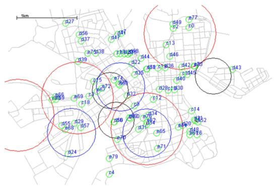 Simulation map of downtown Helsinki. The streets are marked gray. The map scale is shown at the top. Nodes are numbered in blue. Regions of interest marked with red, blue, and black for geocast groups one, two, and three. Green circles depict the nodes’ communication ranges.
