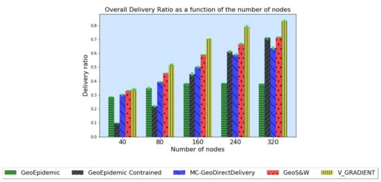 The delivery rate for most protocols increases as the network density (i.e., the number of nodes) increases, as more contacts between nodes help message dissemination. One exception is the GeoEpidemic protocol that disseminates messages without any geographical constraints, thus wasting resources outside the ROI. This means that nodes can be congested with messages that are not useful, because they are outside their ROI, preventing other useful messages from being disseminated. This is particularly significant for geocast groups with small ROI. Therefore, the GeoEpidemic delivery rate does not increase for cases with more than 160 nodes. The other protocols limit message dissemination outside the ROI, so they are less affected by congestion. The V-GRADIENT always achieves the highest delivery ratio compared with the other protocols. using the case of the 160 nodes as an example, the V-GRADIENT shows a 19.5% increase in the overall delivery rate in relation to the GeoS&W protocol, 40.4% in relation to the MC-GeoDirectDelivery, 56.4% in relation to the GeoEpidemic Constrained, and 84.1% in relation to the GeoEpidemic protocol.