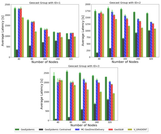 Considering the average latency results obtained for messages pertaining to the geocast group with ID = 3, which encompasses 25% of the total number of nodes, while the V-GRADIENT performance shows improvements as the number of vehicles deployed in the network grows, the results associated with the MC-GeoDirectDelivery and GeoS&W protocols show minor variations. This effect is related to the low degree of cooperation shown among nodes for the latter protocols, which limits the exploitation of an increasing number of contact opportunities. Conversely, the V-GRADIENT protocol carefully selects regions where the replication is not restricted, allowing nodes to seize the surrounding contact opportunities with the aim of enabling a quick propagation of messages locally, even though the selected carrier nodes may not show interest in such relayed messages.