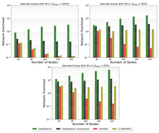Looking at the results for geocast group with ID = 1, which includes all nodes deployed in the network, it is possible to see that the performance of the GeoS&W and V-GRADIENT protocols is similar and tends to significantly improve as the density level increases. Naturally, this enhancement is justifiable not only by the use of the same spraying mechanism on both strategies; on the other side, for the remaining geocast groups, the GeoS&W protocol yields better results since it imposes a limit on the number of copies to be transmitted, unlike the V-GRADIENT protocol. In turn, at the cost of jeopardizing the performance in terms of overhead, the V-GRADIENT algorithm exploits node resources located inside the flooding range, Rflooding, to increase the delivery probability of geocast groups with low penetration rates, which was considered more important than the corresponding overhead cost.